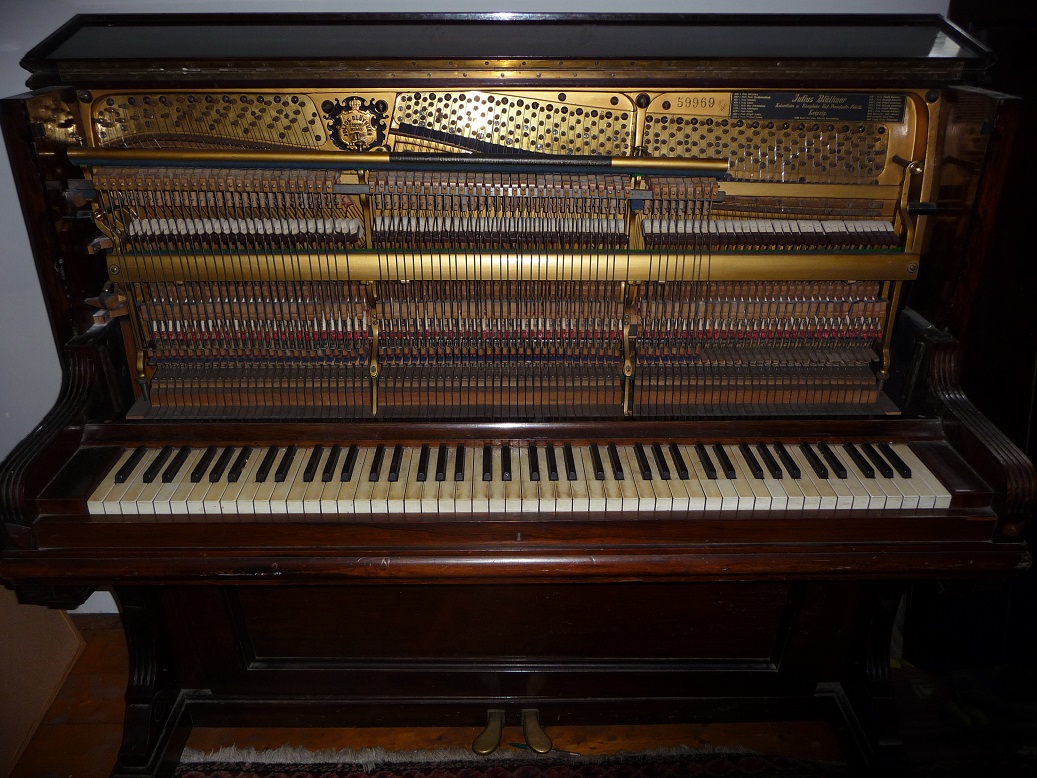 BLUTHNER Upright No: 59969 . This over-strung , manufactured in 1902 has an over damper action , which, because its a Bluthner and its had new damper felts actually performs as well as (if not better than) an English under damper of this period! The original strings & pins are still good and combine with the recently overhauled action to produce a rich tone with a responsive even touch. Currently @ A.430 Hz it will require a double tuning to restore the pitch and because the cabinet - H:130cms W:154cms D:69cms is by no means immaculate this quality instrument is offered at the reduced - - - - - - - -